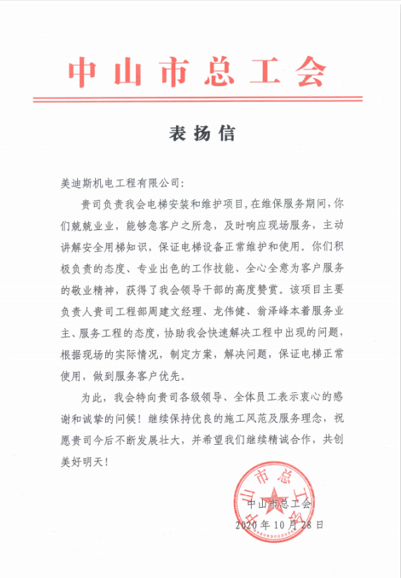 电梯的安全运行,离不开电梯维保人员日常的努力。近日,美迪斯工程服务部收到了中山市总工会发来的表扬信: “在维保服务期间,兢兢业业,能够急客户所急,及时响应现场服务,